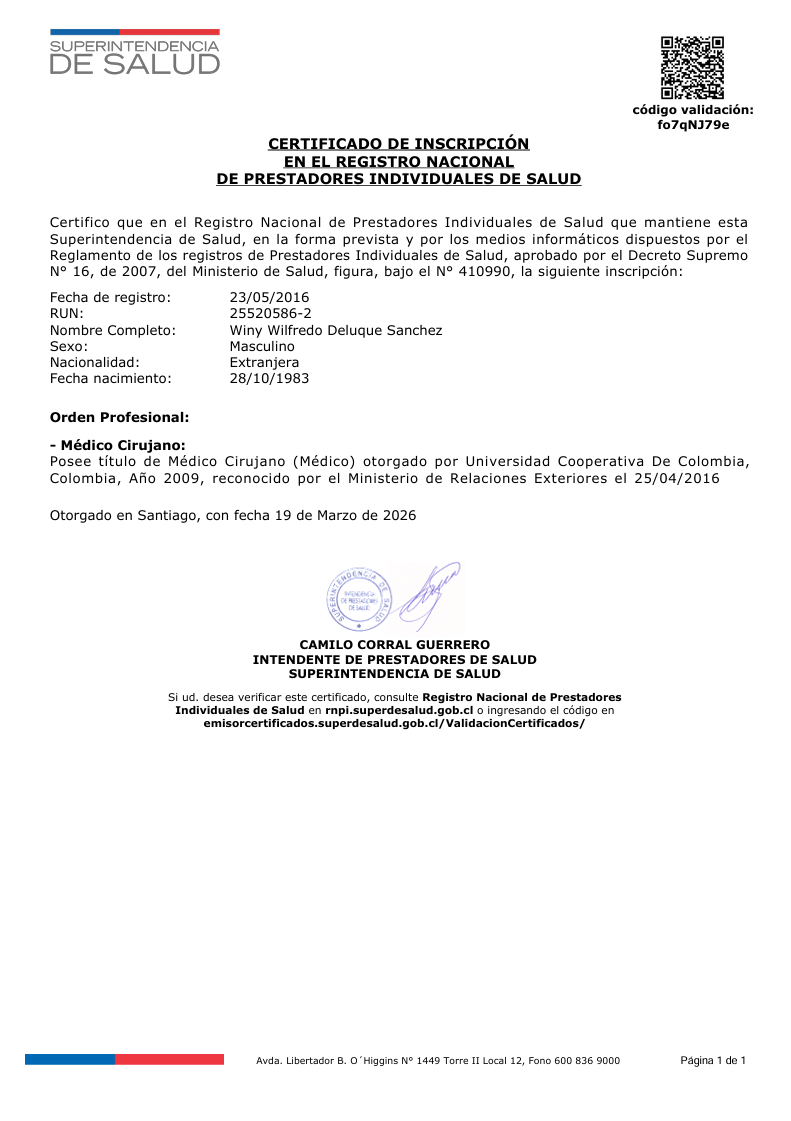El Dr. Winy Wilfredo Deluque Sanchez es Médico Cirujano con formación profesional y registro oficial en Chile. Se caracteriza por brindar una atención cercana, responsable y orientada al bienestar integral de sus pacientes. Su compromiso es ofrecer un servicio médico seguro, humano y basado en estándares profesionales reconocidos.